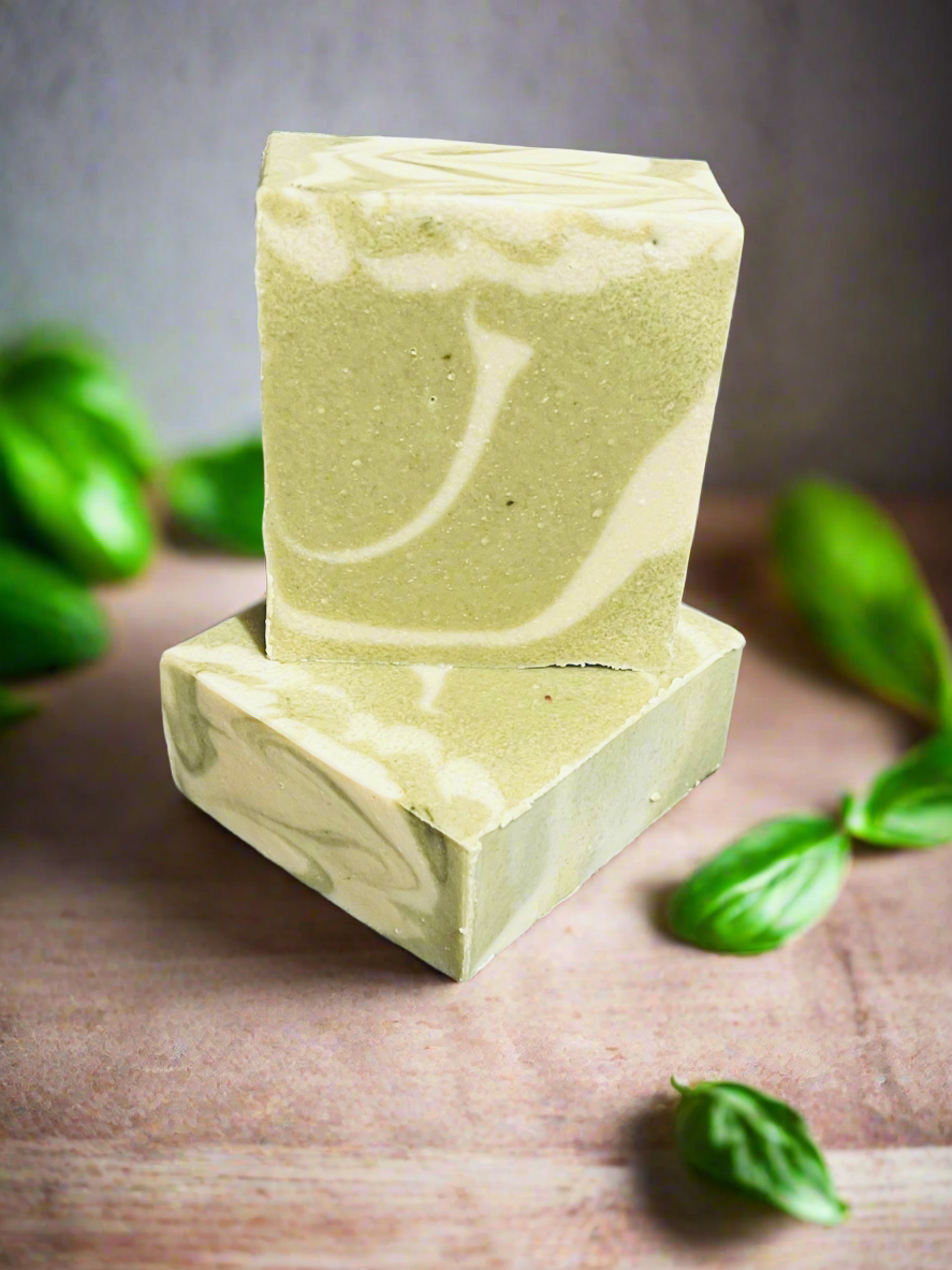 This goat milk soap contains spinach powder, which is known for its ability to protect the body from UV light and reduce cell damage. Additionally, spinach is believed to help fight acne by removing impurities that can clog pores.