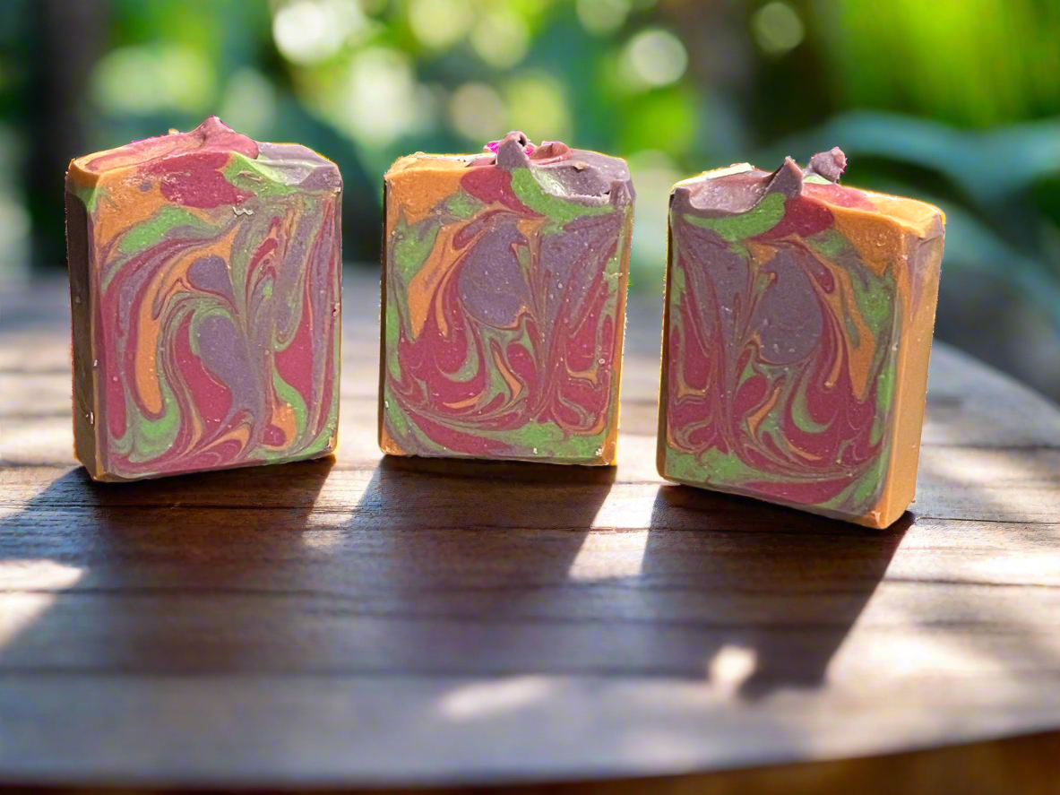 This bar blooms with a lively fusion of floral, coconut, and citrus notes, softened by a warm base of musk and sandalwood. The result? A luxurious lather and an unforgettable scent that’s both energizing and grounding.