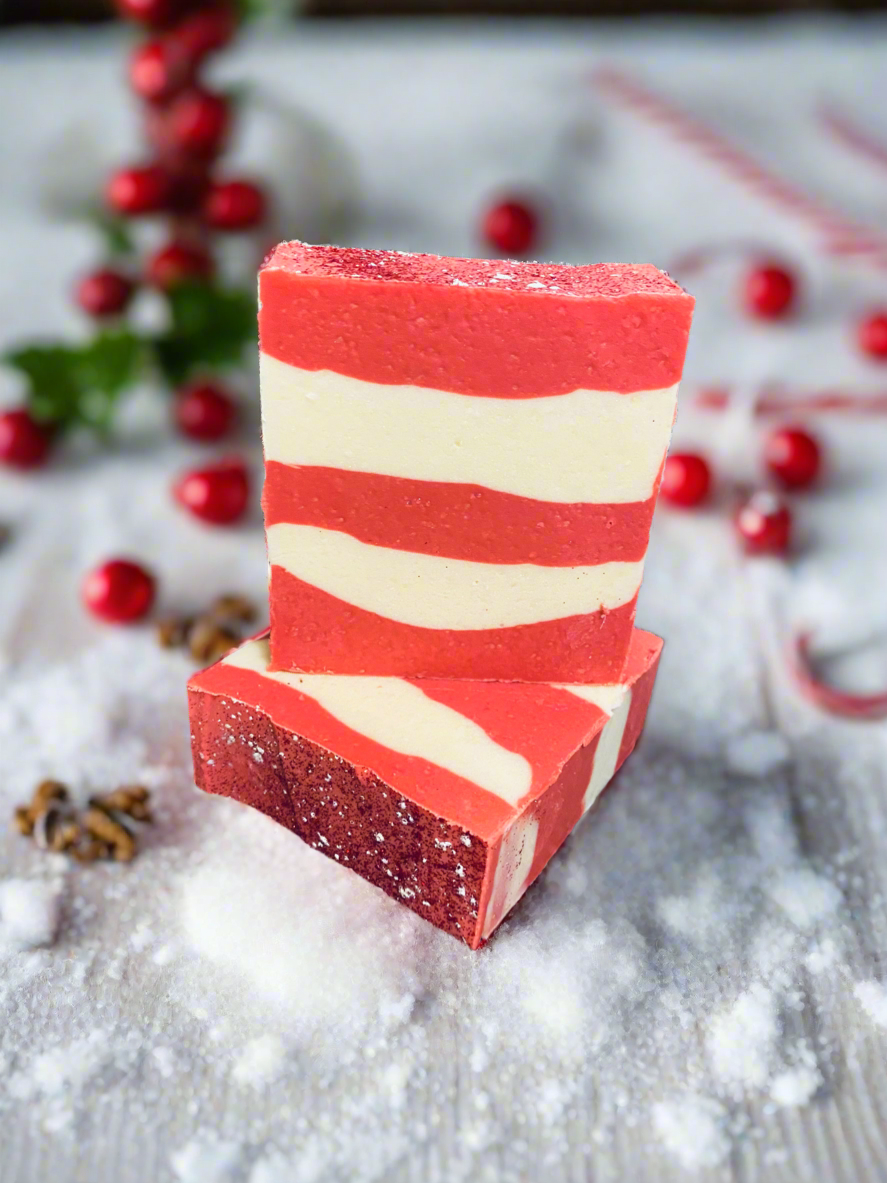 This festive goat milk soap perfectly captures the seasonal candy cane, boasting a delightful and refreshing aroma of sweet mint. Immersing yourself in this soap will transport you to a holiday wonderland.