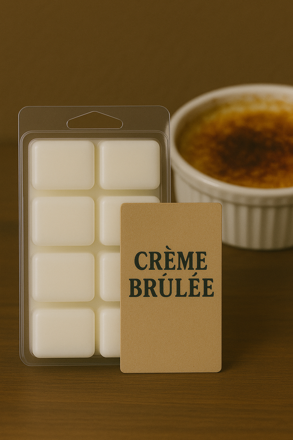 Crème Brûlée Wax Melt: features the scent of lightly caramelized sugar and a hint of coconut before giving way to a rich creamy custard heart. A dash of rum elevates the vanilla and maple base, a true scent of decadence and warmth.