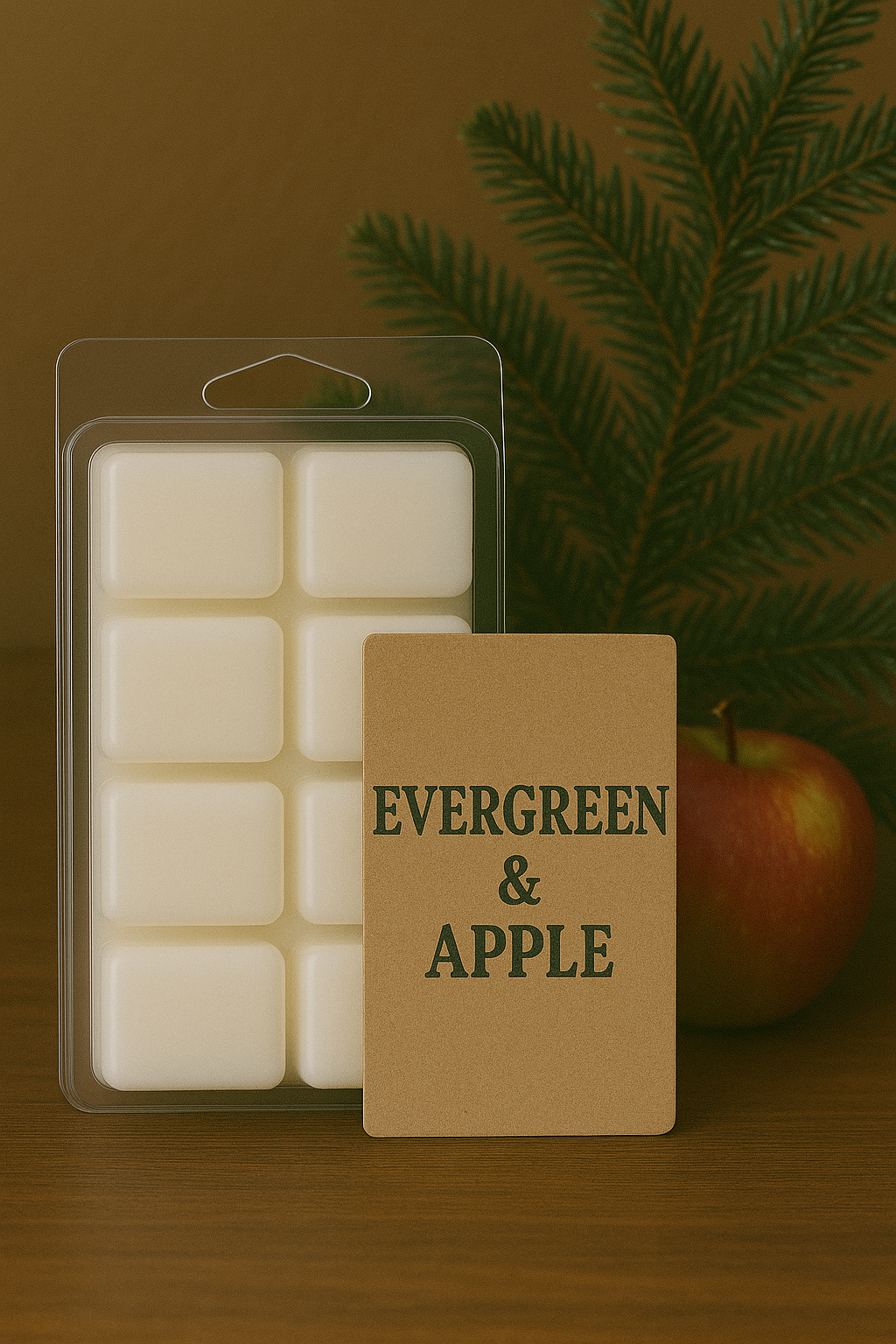 Evergreen and  Apple:  Bright top notes of apple and mandarin create a sweet, fruit-forward beginning. This fragrance's uplifting aromatic heart is discovered through notes of fir and juniper, balanced by tart cranberry. Base notes of rich cedar and sugar effect a smooth finish to round out this aroma.