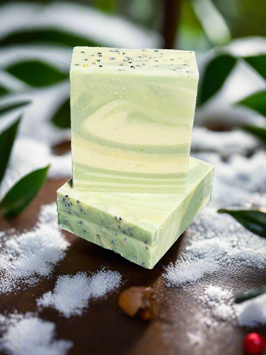 Experience the delightful scent of wild berry, pineapple, pacific breeze, silver fir, blue spruce, plumeria, and musk in this luxurious holiday-themed soap, perfect for the season of cutting down your family's Christmas tree. Made with goat milk for a nourishing and gentle cleanser.