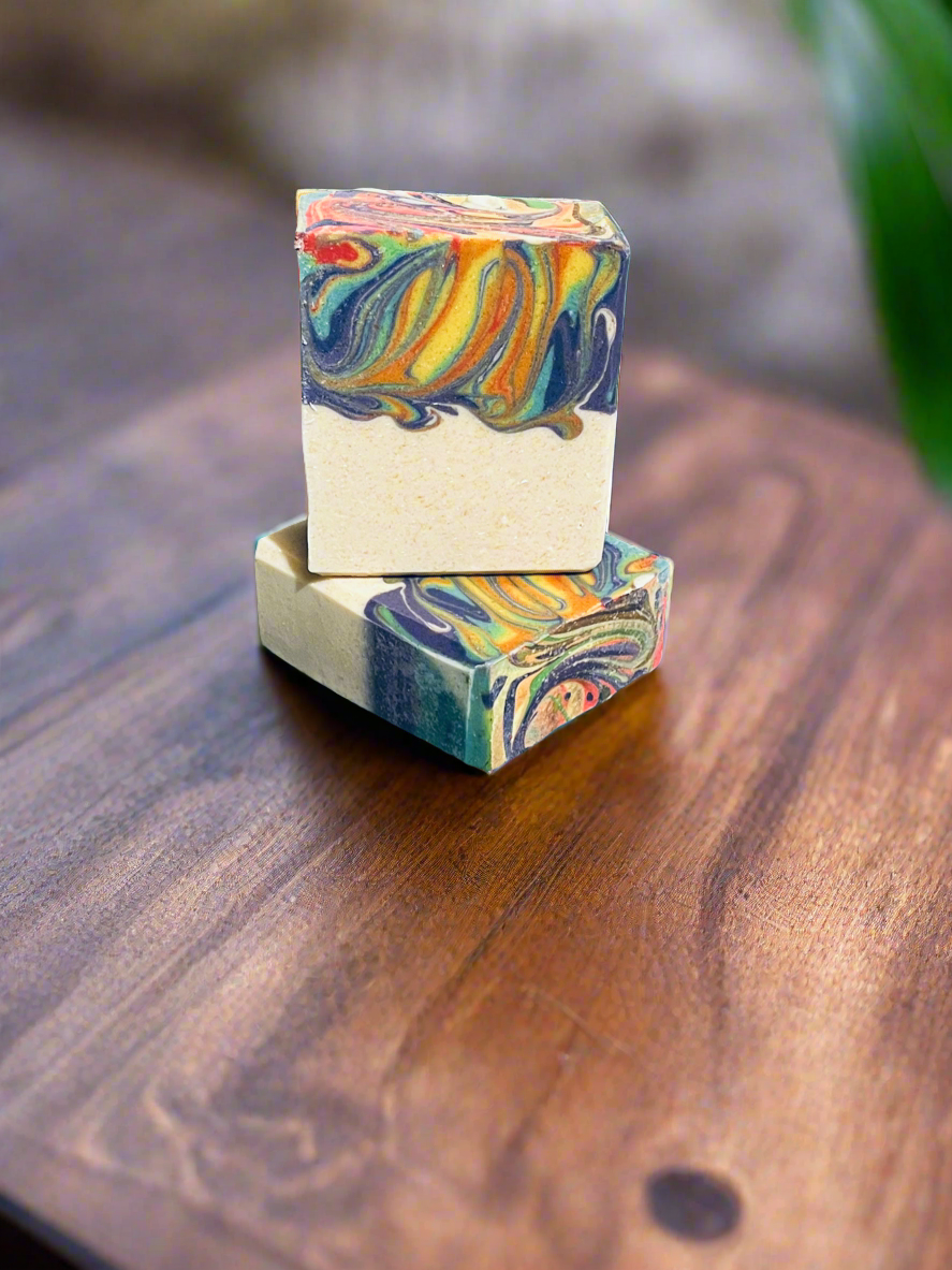 Previously known as "Fruit Rings", Over the Rainbow has a subtle fragrance that may not linger, but it remains a stunning bar of soap. Its scent may range from unscented to lightly scented, with no guaranteed strength.