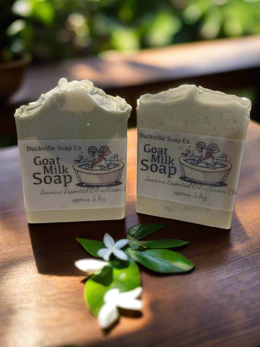 This goat milk soap features French Green Clay and Jasmine Essential Oil. Goat milk combines gentle cleansing with the detoxifying benefits of French Green Clay and the soothing aroma of Jasmine Essential Oil.